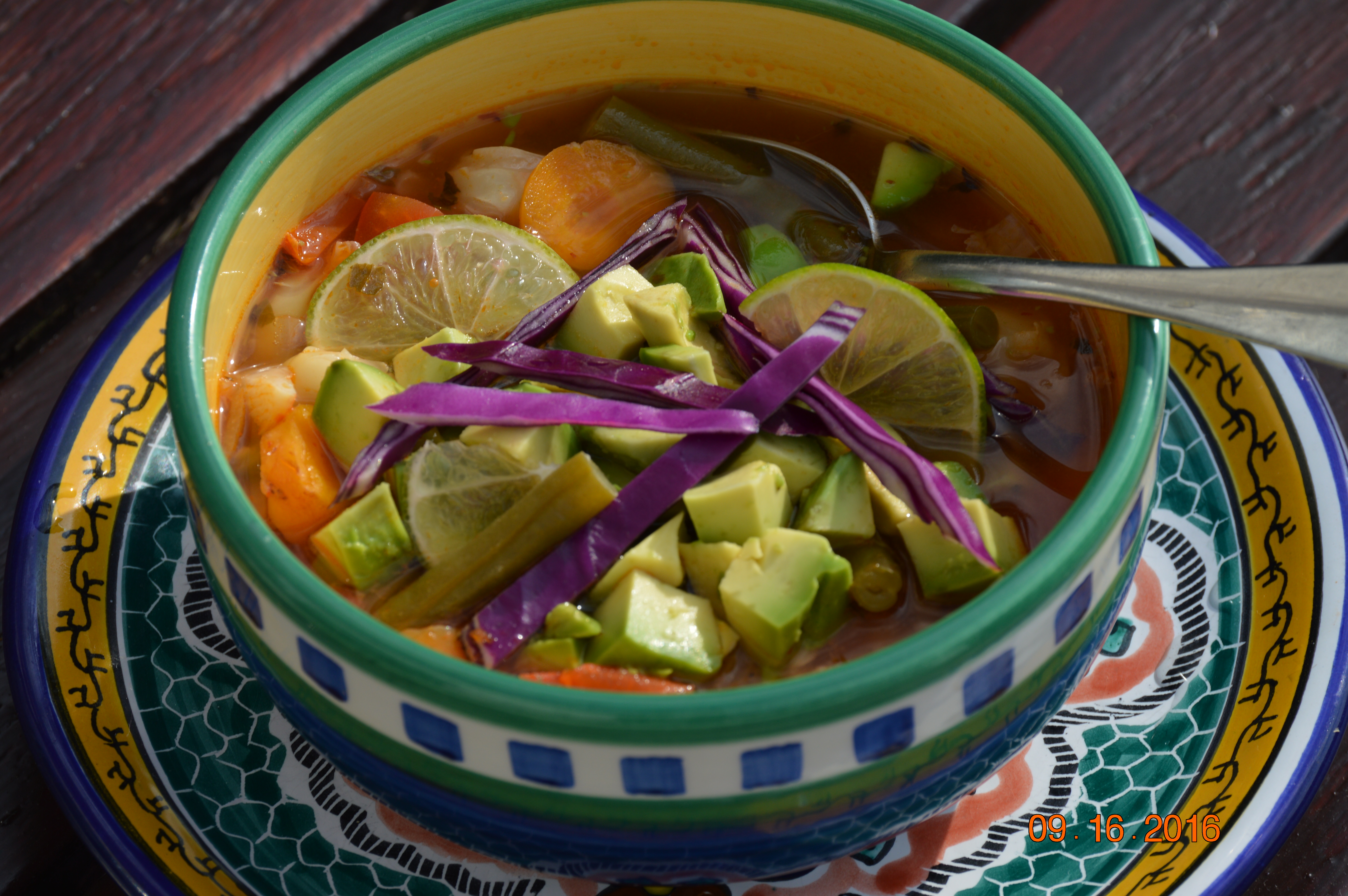 • Ratatouille Soup with chunks of eggplant, zucchini squash, patty pan squash, summer squash, onion, tomatoes, tomato paste, mixed greens, oregano, basil, salt and hot paprika.