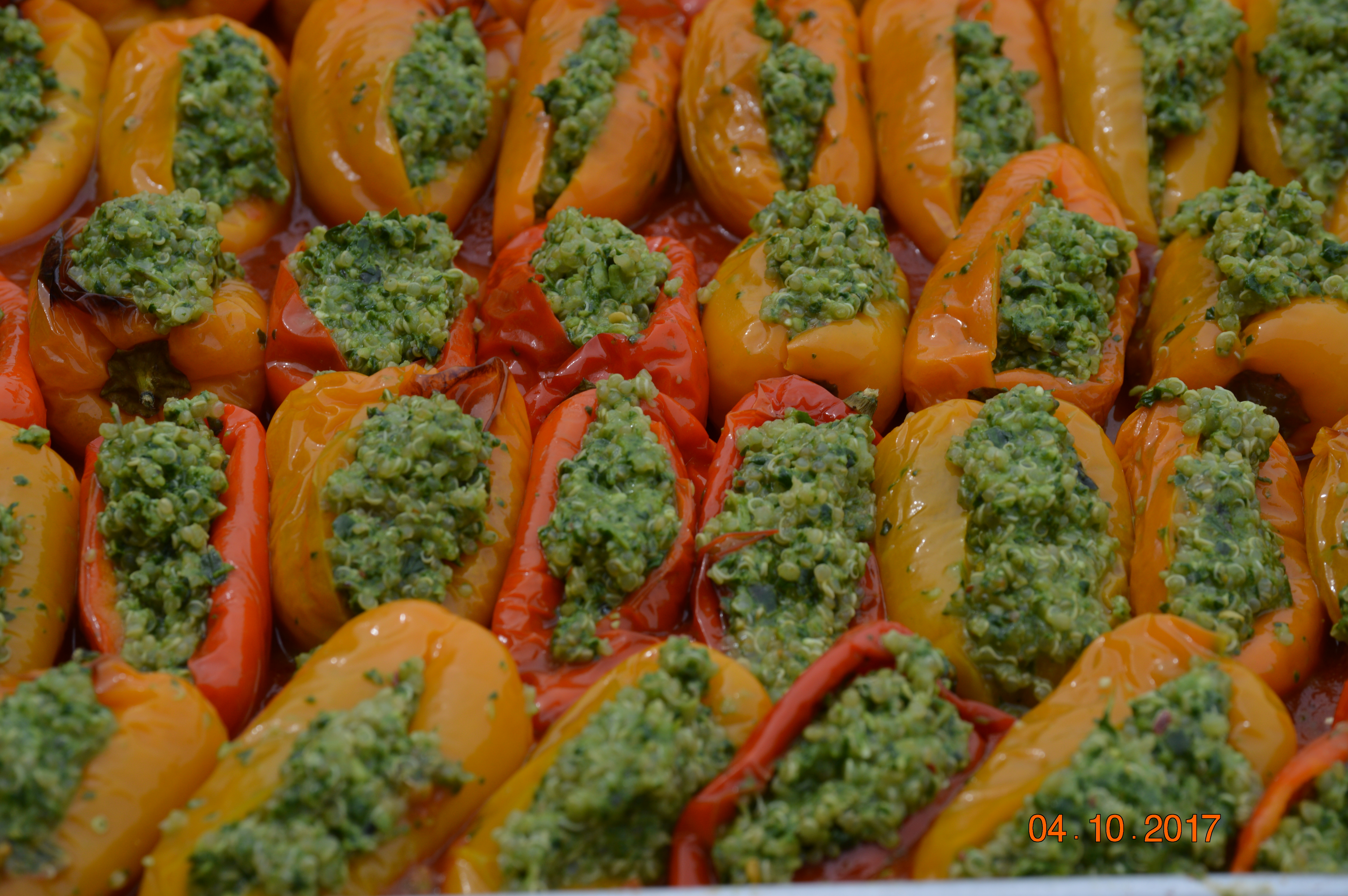 These delicious vegan stuffed mini-peppers are a variation of a dish I sometimes make when it’s not Passover using regular size yellow bell peppers, couscous and vegan pesto. For Passover, I replaced the couscous with quinoa. Happily raw pine nuts aren’t kitniyot,