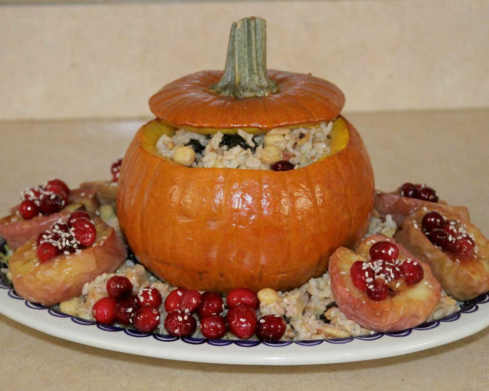 If you make everything ahead, warm each part separately. When ready to serve, fill the pumpkin loosely, replace pumpkin lid, and plate the pumpkin. Surround the pumpkin with the remaining filling, and place the apples on top of it around the pumpkin. Top the apples with cranberry sauce, and garnish with white sesame.